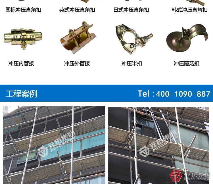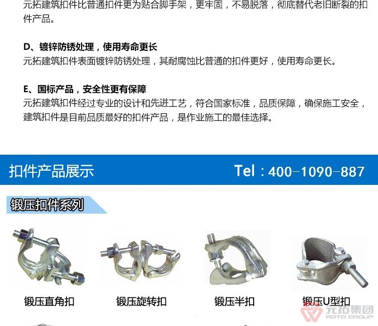 元拓集團(tuán)生產(chǎn)銷售的出口型扣件,腳手架扣件,建筑絲杠,碗扣腳手架配件等,產(chǎn)品嚴(yán)格按照GB15831-2006國(guó)家標(biāo)準(zhǔn)檢驗(yàn)后出廠,質(zhì)量長(zhǎng)期穩(wěn)定可靠,產(chǎn)品被廣泛應(yīng)用于建筑工程行業(yè).暢銷全國(guó)各地建筑市場(chǎng),并出口到多個(gè)國(guó)家和地區(qū),產(chǎn)品質(zhì)量?jī)?yōu)異,全國(guó)排名榜首,服務(wù)專業(yè)完善,得到了各方客戶的認(rèn)可和支持。