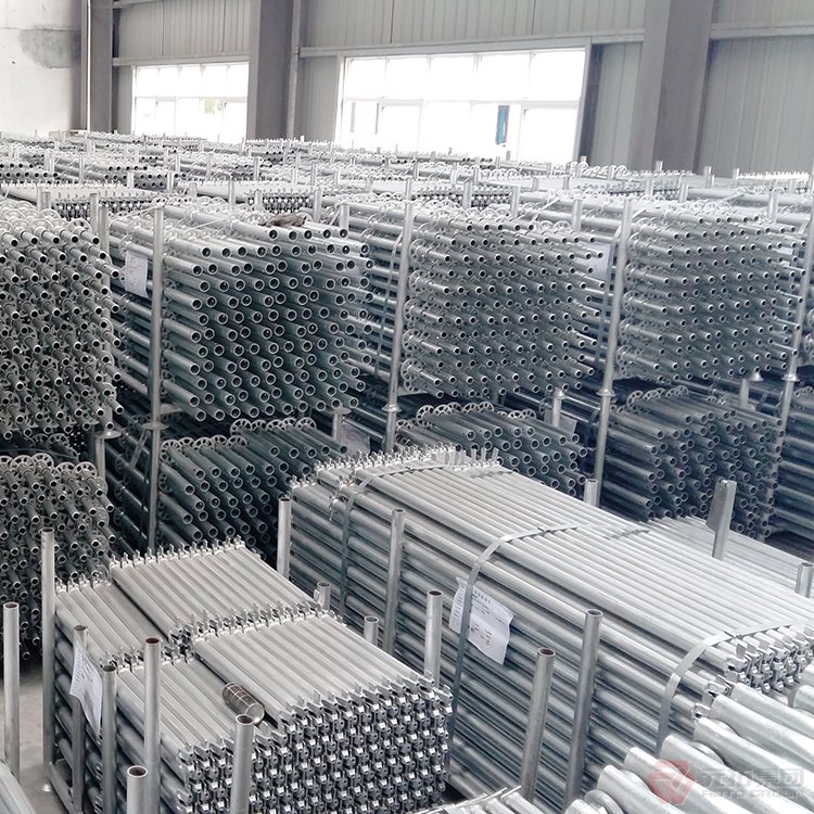立桿:立桿是盤扣式腳手架的主要支撐部件,材質(zhì)一般采用Q345B,長可做成3M,國內(nèi)通常做成2M居多,壁厚3.25MM。直徑48和60MM的鋼管上每隔0.5M焊有可扣接8個方向接頭的圓形連接盤,立桿一端焊有連接套筒或者內(nèi)部連接棒,用以垂直方向的立桿接高。
